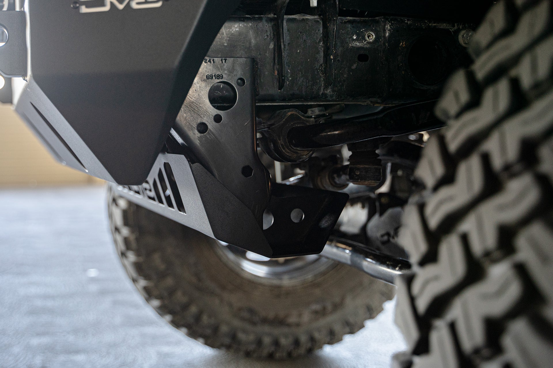 One of the primary functions of this skid plate is to safeguard the disconnect motor for the sway bar, shielding it from potential damage caused by striking obstacles underneath your Jeep. With our upgraded design, you can confidently navigate rough terrains, knowing that your sway bar disconnect is well-protected. Not only does our skid plate offer essential protection, but it also enhances the overall look of your Jeep’s undercarriage. It neatly covers the exposed frame horns or crash bar when running an aftermarket bumper, giving your vehicle a cleaner and more streamlined appearance.